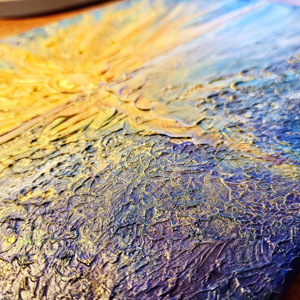 | 説明 | 太陽が放つエネルギーがあまりにも強すぎて周りの闇をかき消していくイメージを現した。どんなに暗い闇に包まれても、太陽が出てくれば、必ず光に包まれる。心の状態とよく似ている。この絵は明るい光を生み出し、前向きに過ごせることを祈っている。 |